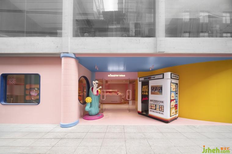 入口區(qū)域的品牌IP 被塑造成一個富有趣味性的藝術(shù)裝置:戴著夸張?zhí)栄坨R的卡通形象與擬人化仙人掌,成為吸引顧客拍照打卡的標(biāo)志性元素。同時,發(fā)光的品牌 Logo 結(jié)合粉色墻面,營造溫暖氛圍,并融入復(fù)古霓虹燈的視覺記憶,使街區(qū)的煙火氣息與品牌的奇幻風(fēng)格完美融合。