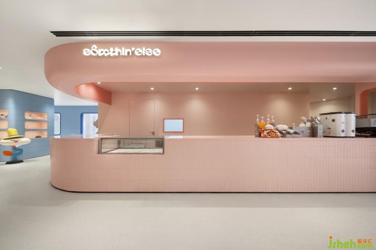 步入店鋪,右側(cè)就是一個溫暖柔和的咖啡區(qū)域。這里不僅是一個提供飲品的場所,更是品牌營造沉浸式體驗(yàn)的起點(diǎn)。粉色瓷磚包裹的弧形吧臺,與整體空間色彩和諧統(tǒng)一,形成治愈且夢幻的視覺效果。