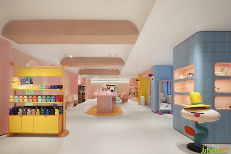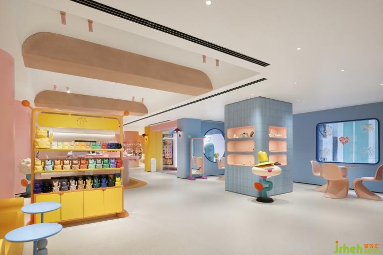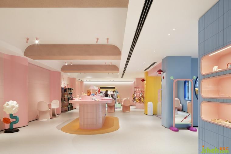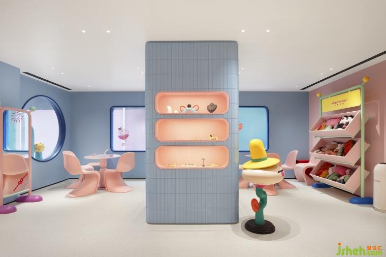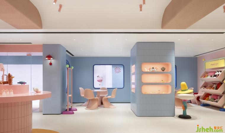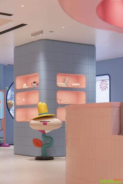層層遞進(jìn)后,不斷展開的彩色體驗(yàn)空間,充滿童趣與夢幻,藍(lán)色的區(qū)域?yàn)樵械闹?,也進(jìn)行了櫥窗式的處理,讓空間中的原始結(jié)構(gòu)徹底消隱,處處是展示。在這些不經(jīng)意的角落,能夠讓顧客探索發(fā)現(xiàn)更多的新奇商品。