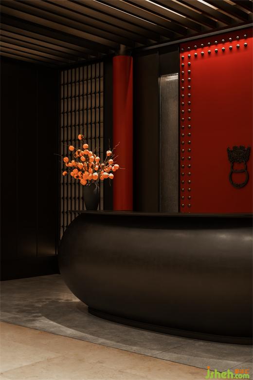 前廳接待引入柿子的結(jié)構(gòu)形態(tài),和品牌名稱完美呼應(yīng)。墻體背景巧妙地融入了京味文化中的故宮元素以及北京城中軸線的特色,以朱紅正色的大門為中心,兩側(cè)以對(duì)稱的柱體和柿花元素的屏風(fēng)作為裝飾,不僅體現(xiàn)了中國傳統(tǒng)美學(xué),還賦予空間場(chǎng)域新的生命力。