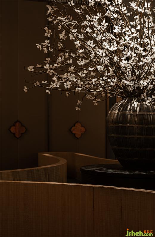 橘色燈光的玻璃磚、溫暖的紅磚、柿花與金屬板結(jié)合的皮藝屏風(fēng),設(shè)計(jì)師有序的將其置于空間之中,交相重疊。