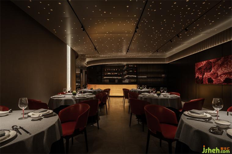 宴會廳頂部則隱藏著另一個世界,漫天星光以柿花的形態(tài)呈現(xiàn),稍顯不真實的朦朧浪漫之感,行走其中,仿佛和現(xiàn)實生活中的鋼筋水泥相隔離,實現(xiàn)獨特的就餐體驗。