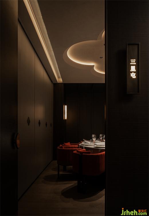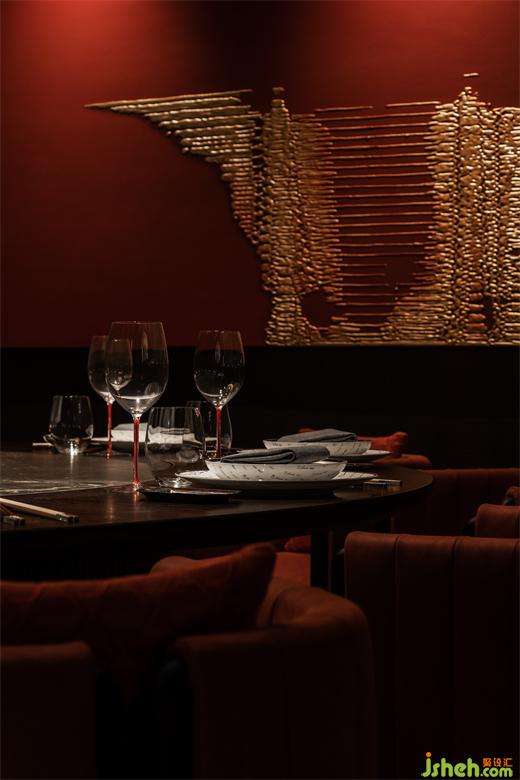 節(jié)奏清晰的空間動線排布,串聯(lián)為彼此貫通的區(qū)域。餐廳設(shè)計包房內(nèi)的柿花形態(tài)頂部和云石材質(zhì)的吊燈交相輝映,為空間注入別樣的藝術(shù)氛圍。室內(nèi)的藝術(shù)品和紅色鋸齒紋椅搭配,給予包房內(nèi)獨特的個性美學,讓其成為一個神秘的小世界。