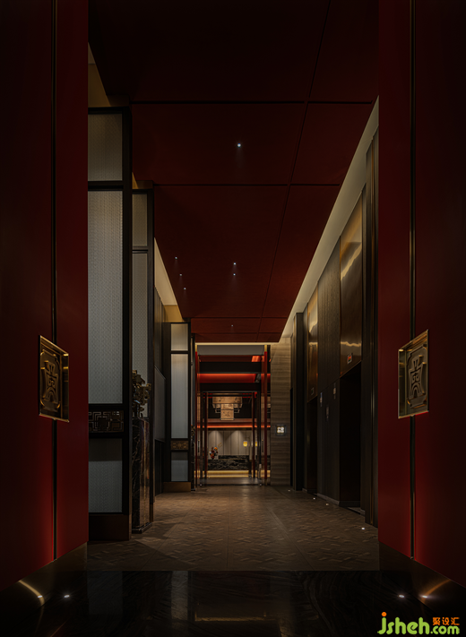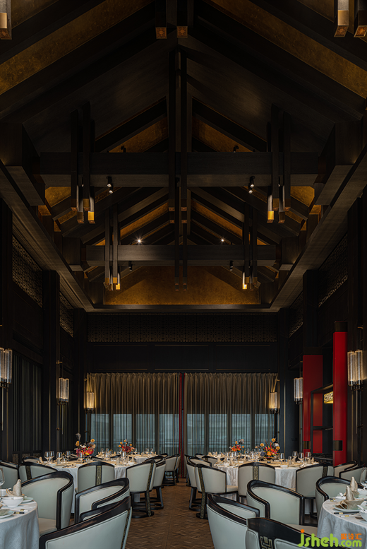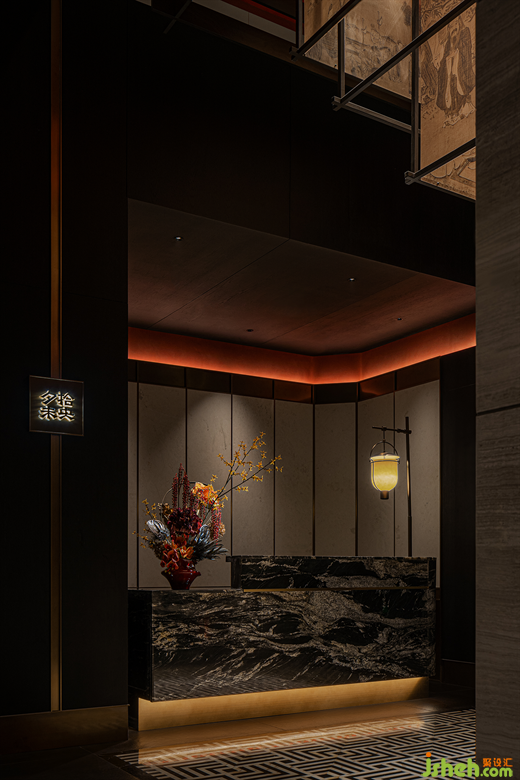 大廳以“章華”為名,天花構(gòu)架以傳統(tǒng)斗拱為靈感,取其結(jié)構(gòu)之美,用現(xiàn)代手法重新演繹,賦予空間十分考究的內(nèi)涵氣質(zhì),再現(xiàn)傳統(tǒng)建筑的結(jié)構(gòu)美學(xué)。