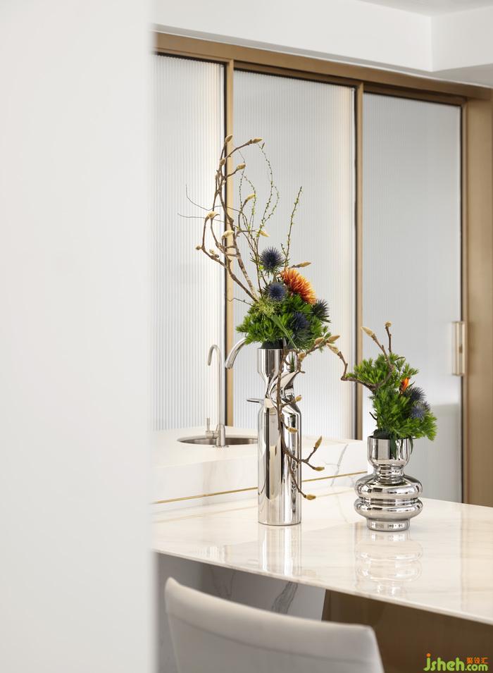 語(yǔ)堂空間設(shè)計(jì)局部的金色線條勾勒出細(xì)膩的精致幾何,豐富視覺感官的層次和維度,蘊(yùn)藏著設(shè)計(jì)師對(duì)生活的態(tài)度,品味與追求,在空間中得到完美詮釋。