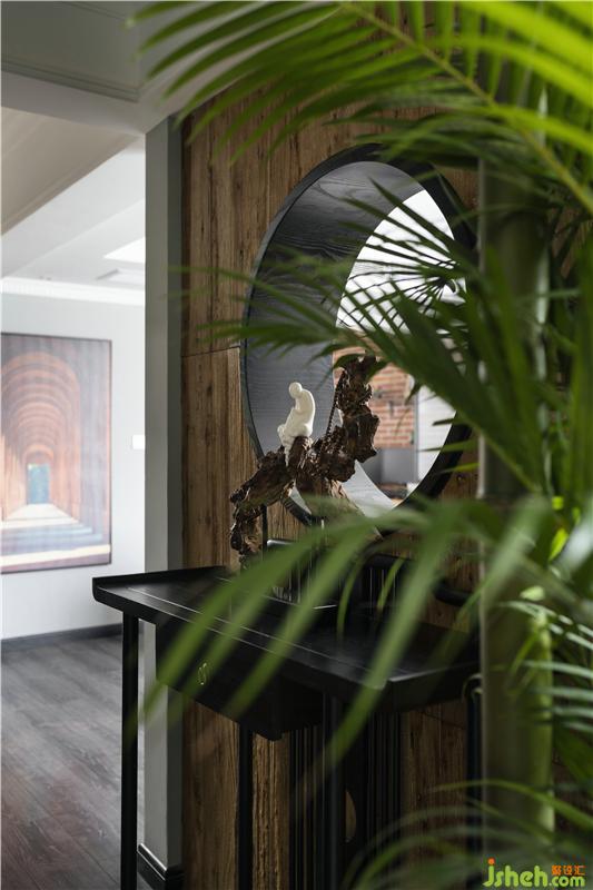 本案例中,室內(nèi)設(shè)計師采用以暗淡的灰、黑色系為渲染的色調(diào),移步于景,入戶端景墻處以中式中心對稱及框景手法,仿佛電影中鏡頭,捕捉圓環(huán)背面景色,墻面采用飽和度高的暖色老木板,側(cè)面引入戶外竹子與綠植,冷暖色系交相呼應(yīng),光與影的介入,給整個畫面提升視覺沖擊感,竹子下方門檻引入日式“枯山水”,青石板與白色鵝卵石搭配細節(jié),讓人心靈更加安靜與自然。