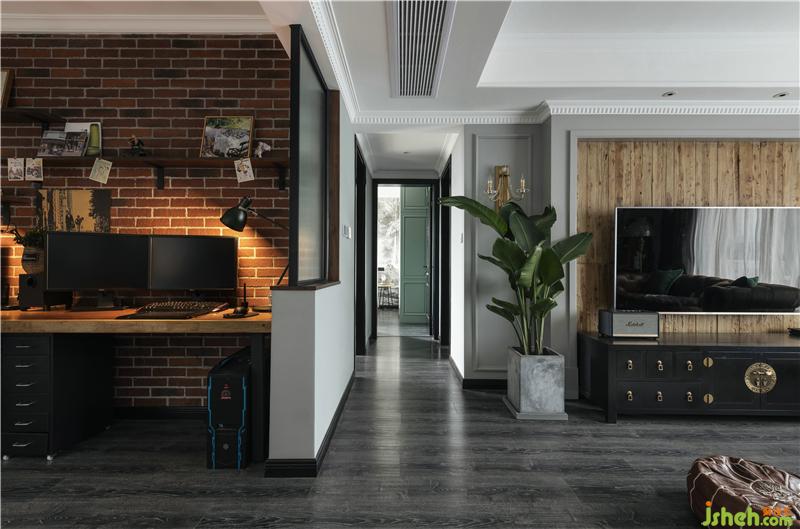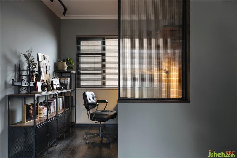 書房采用大面積紅色文化石作為背景,為做動畫設(shè)計專業(yè)的業(yè)主帶來工作的激情,同時暖色燈光與自然光線的介入,斑駁凹凸的文化石更具立體感,懷舊情懷映入眼簾。室內(nèi)設(shè)計師以長虹玻璃作為半隔斷,光影與色彩透過玻璃若隱若現(xiàn),書房與客廳形成情感溝通與互動。