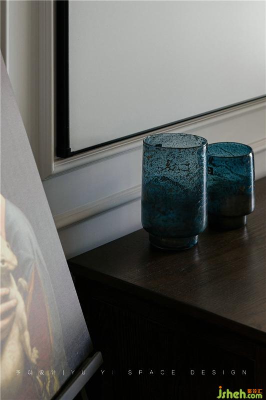 整齊有序的物件陳列映襯出屋主精致的生活狀態(tài),深藍、深綠色的抱枕與淺色的布藝沙發(fā)在色相與明度上交相呼應,并形成冷暖色系對比,仿佛油畫里的筆觸,和諧、寧靜。