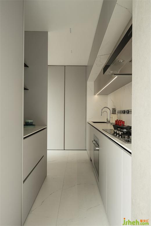 餐廚空間運(yùn)用大面積的巖板,在結(jié)合整體氛圍滿足功能使用的同時,讓空間的形體表現(xiàn)得更有節(jié)奏感。