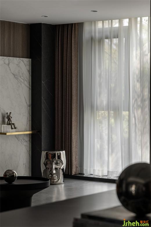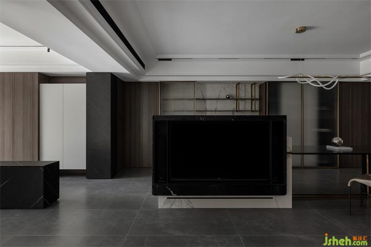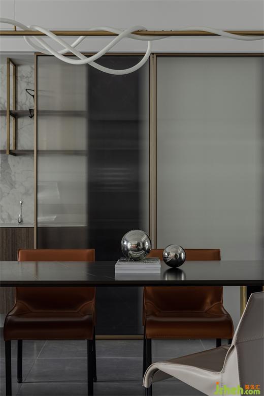 金色、銀色金屬材質(zhì)與板材、巖板、石材材質(zhì)進行碰撞,讓空間質(zhì)感增強。