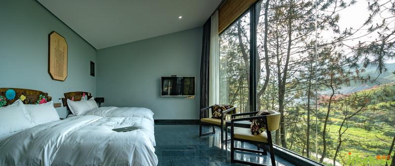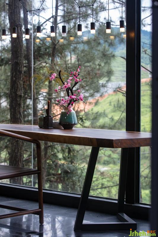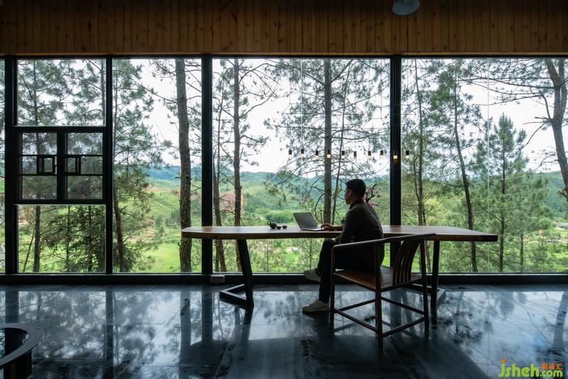 依山而建的兩層小木屋,將每個空間都融入到松林樹梢的奇特感受里。把最好的觀景方向是全落地玻璃,鄉(xiāng)野風(fēng)情盡入眼底。