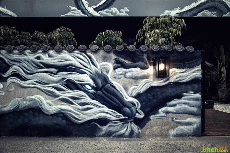 Stepping into the interior, the exposed white stone wall and cement floor match each other to spread a layer of simple background color. The black graffiti like flowing lines are applied to the log chairs and benches. The white cement wall is wrapped on the wall to form a special gray and dark texture. The designer has extracted the gray tiles and white walls, which symbolize the Hui school's characteristics; the flying murals are derived from the exploration of the Chinese world, which is a mixture of casual indulgence and calmness, which reminds every dormant person who comes here.