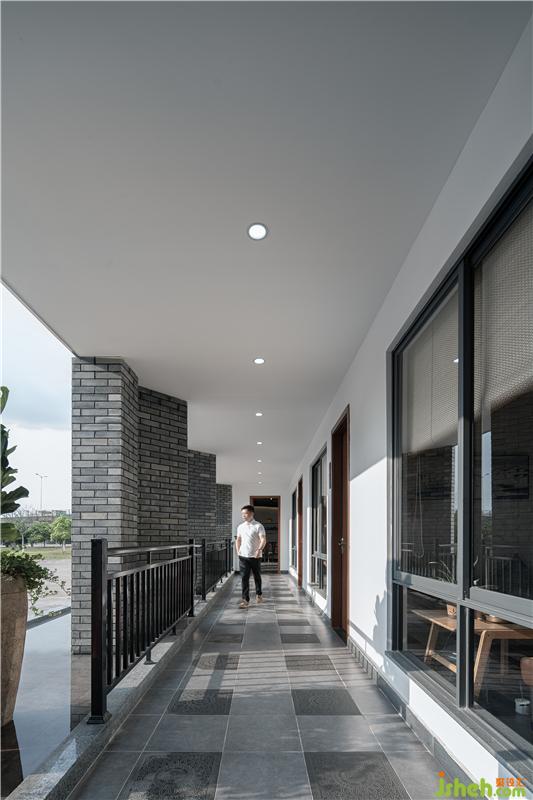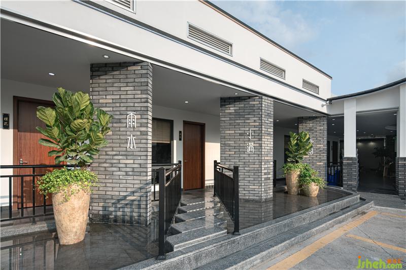 立面巧妙的用斜墻營造出輕盈的中式連廊,原木青磚片整齊有序的排列在白墻中,留白的素墻簡(jiǎn)潔的隔斷自由穿行,自然而然的成為最淋漓的表現(xiàn)方式,簡(jiǎn)約的中式外立面,干凈利落的以設(shè)計(jì)表達(dá)出整個(gè)空間氣韻。