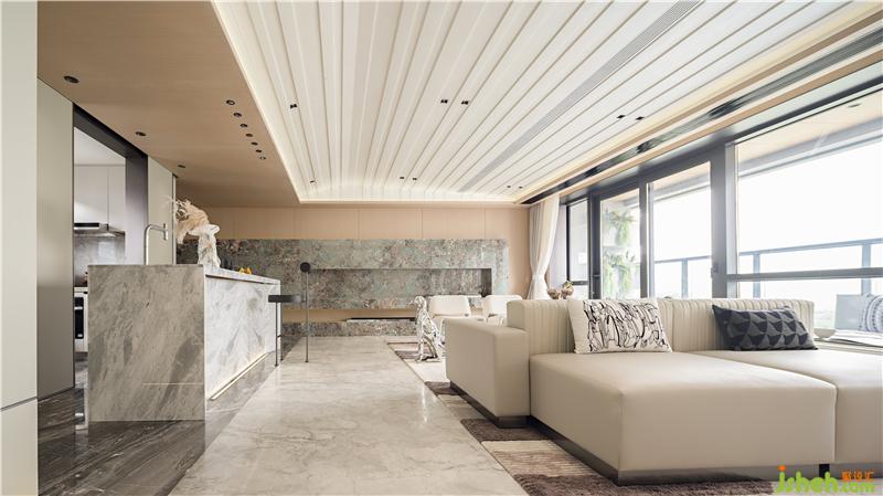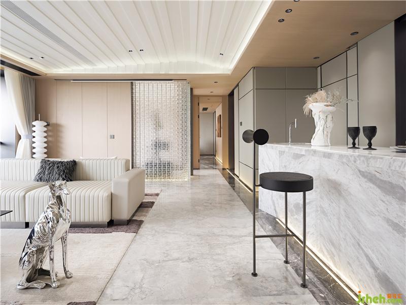 整個空間建構(gòu)是現(xiàn)代的、簡潔的體塊穿插,陳設(shè)與色彩的細(xì)膩帶給人一種內(nèi)心豐實感。蘇州樣板房設(shè)計與亞馬遜綠大理石造型相對應(yīng)的是視線移至品鑒室玻璃磚墻透出的光束,隔而不分的圍合給人一種被擁抱的感受,創(chuàng)造一種親切、充滿人情味又不失私密的洽談環(huán)境。