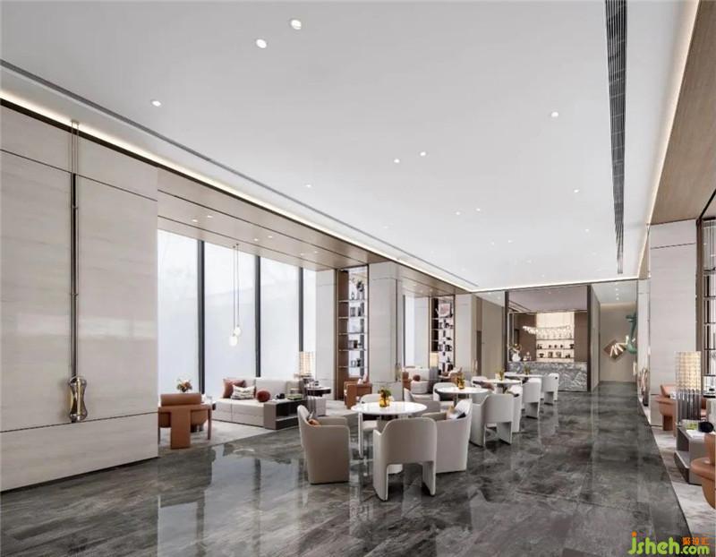 大面的落地窗戶將室外自然水景最大引入,在光線的折射下構(gòu)筑自然與室內(nèi)、與人之間的觀感互動。