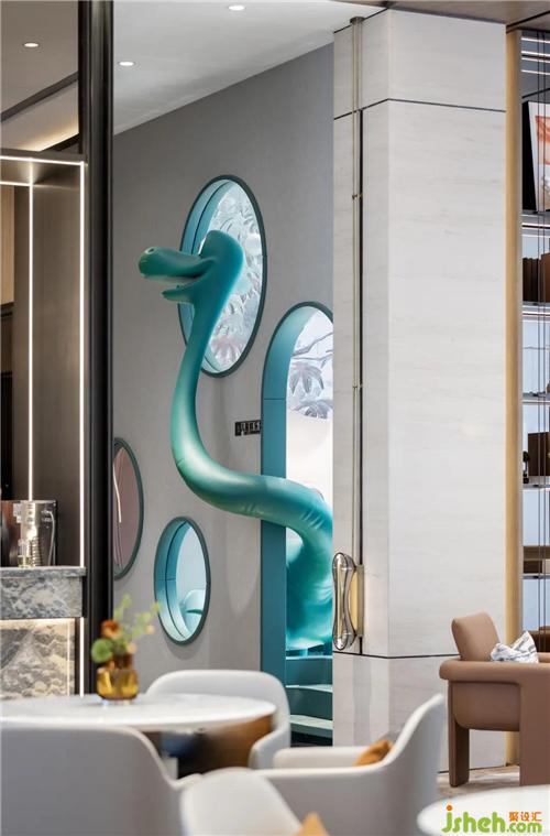 兒童區(qū)以趣味的恐龍世界,為都市的繁忙之余開辟一絲溫暖與童趣;回應(yīng)東原人文關(guān)懷.趣味的人機互動增加了人與空間的交互,情景化的打造讓這般簡單的童趣互動在此形成了景中景,還原孩子童真的一面深圳售樓處設(shè)計。