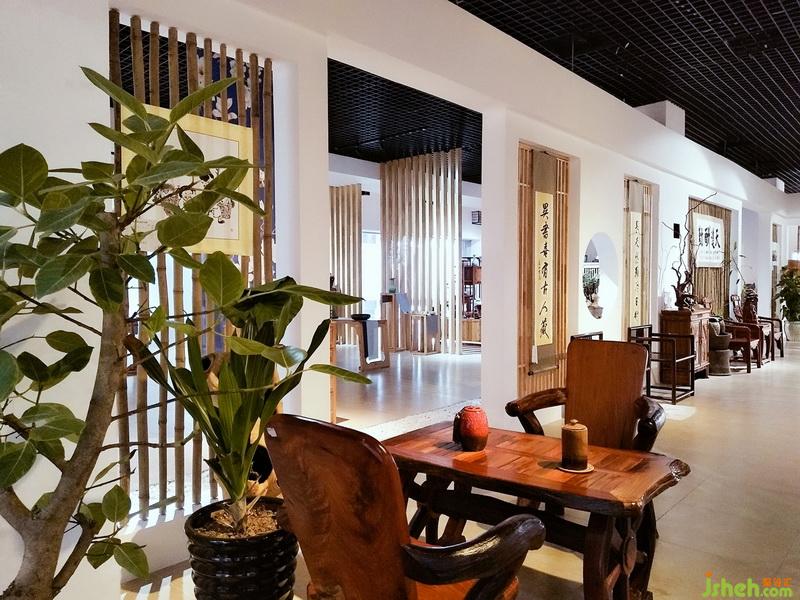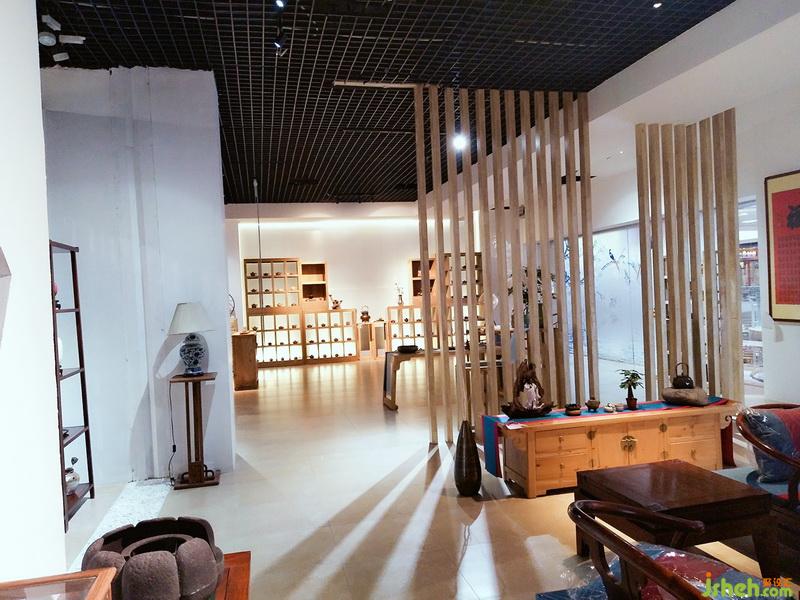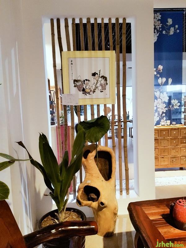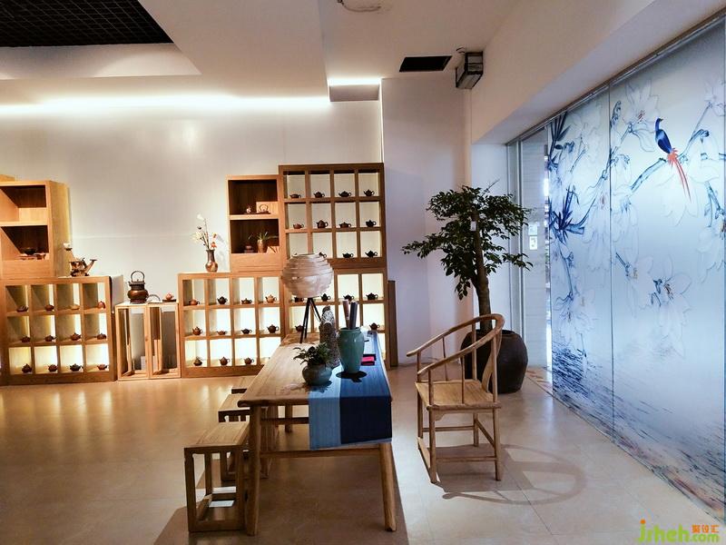 空間區(qū)域劃分為開敞式家具展示區(qū)、相對封閉的體驗式茶藝區(qū)和茶具展示區(qū),區(qū)域分割以鏤空隔斷為主,隔而不斷,相互連接,體現(xiàn)靜怡、謙和氣質(zhì)。白石子優(yōu)雅,木格柵樸素,古人云: “寧可食無肉、不可居無竹”,竹子配以禪意風(fēng)格裝飾畫、白墻,給人帶來一片安逸與禪意。