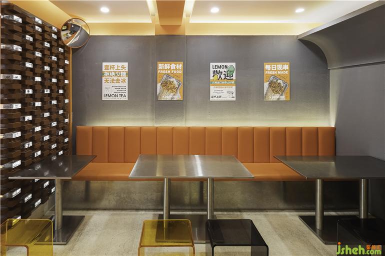 推開門,火熱的橙色撲面而來,空間雖然不大,但濃濃的氛圍讓人感覺并不擁擠,廚房操作區(qū)的墻面采用橙色的鋁塑板,美觀實用。油炸店設(shè)計頂面懸浮的白色石膏板吊頂也以橙色的乳膠漆為背景,使空間輕盈不壓抑。卡座背景以灰色肌理漆為主,搭配暖黃色的燈光和橙色乳膠漆的底色,簡約大氣而有溫馨感。墻面展示產(chǎn)品海報,既豐富了空間層次,又能直觀的表現(xiàn)產(chǎn)品特色。不銹鋼餐桌和黑橙兩色亞克力矮凳搭配橙色金屬吊燈,既時尚簡約而又飽含小巷里人們的生活氣息。