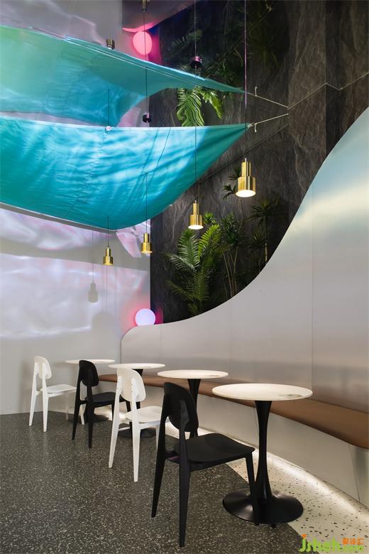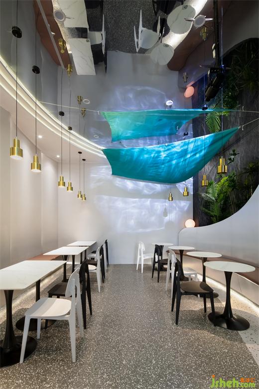整個(gè)外門(mén)面以海水藍(lán)為品牌色,呼應(yīng)海洋文化。由于門(mén)楣較大,所以未做過(guò)于繁雜的造型,材料以米白色肌理漆為底,簡(jiǎn)約大氣,米線店設(shè)計(jì)重點(diǎn)突出品牌LOGO。整個(gè)門(mén)頭抓人眼球,十分醒目。
