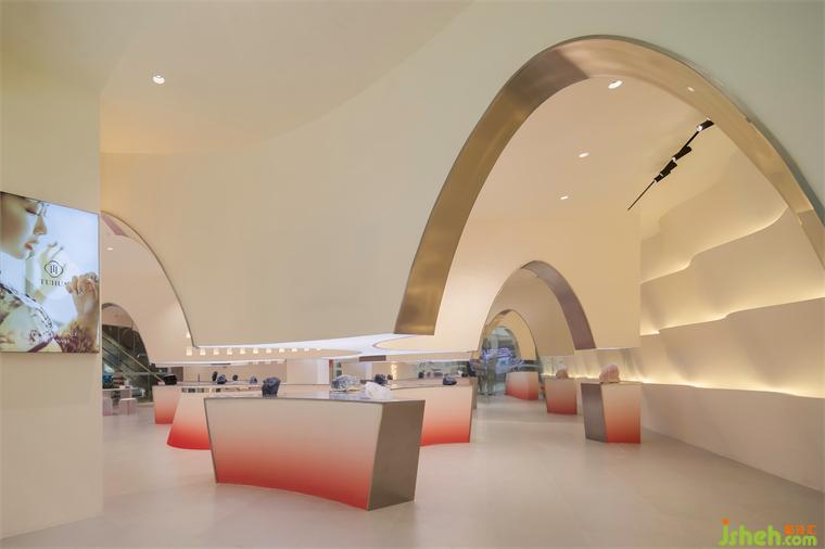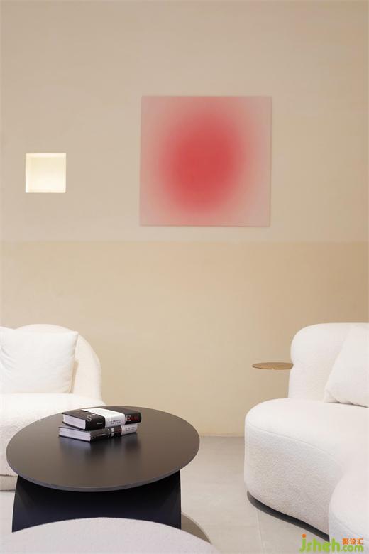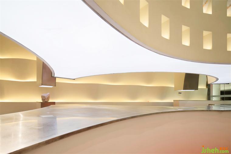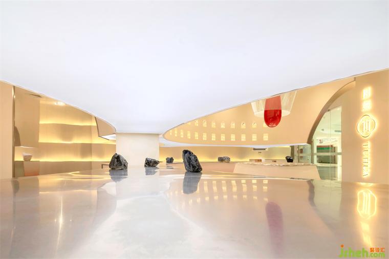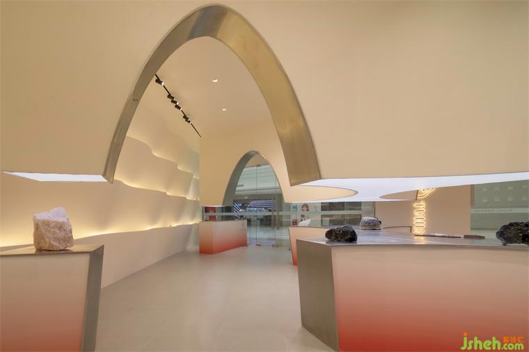 暈染是一種屬于中國傳統(tǒng)繪畫的技法,特點為山水淋漓自然,尤其是霧靄層層。我們提取了暈染的特點用于空間,展廳設計將原本看似毫不相干的各種材料巧妙地融合在一起,猶如藝術的碰撞,點燃了空間中不同元素間的火花。