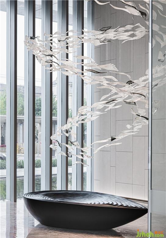 步入門廳區(qū)域濃郁的藝術(shù)氛圍猶如畫卷緩緩拉開,與接待臺(tái)對(duì)應(yīng)的魚群藝術(shù)裝置,寓意美好。