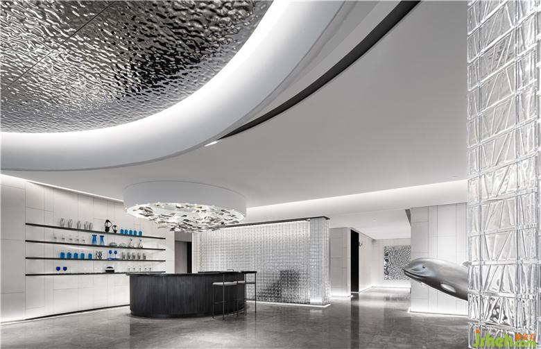 屋頂方面,通過(guò)對(duì)自然流水的模擬,利用鏡面波紋效果氣氛強(qiáng)調(diào)氣氛,將澄澈之色與水系縱橫的自然風(fēng)景納入其中,動(dòng)與靜互相映照,構(gòu)成一幅綺麗的畫面。