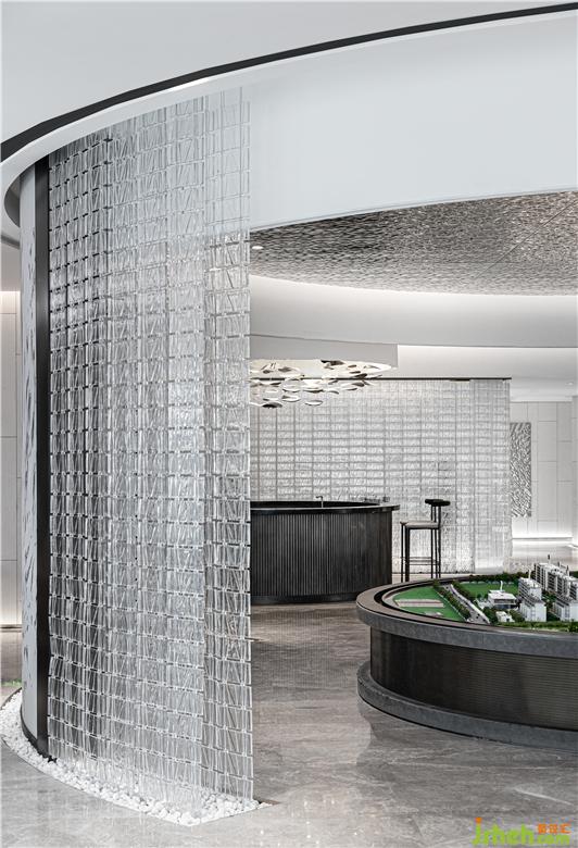 室內(nèi)的動(dòng)線是蜿蜒流動(dòng)的,暖灰色大理石具有豐富自然肌理,售樓處設(shè)計(jì)大面積運(yùn)用于空間中,玻璃磚格柵的環(huán)繞在展示沙盤周圍,如瀑布傾灑而下與金屬質(zhì)感的相互點(diǎn)綴,為人們創(chuàng)造了高雅寧神的別致環(huán)境。