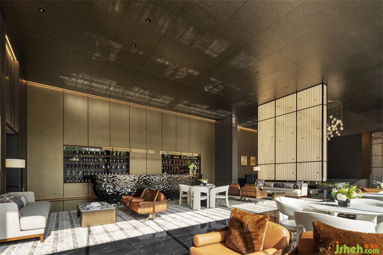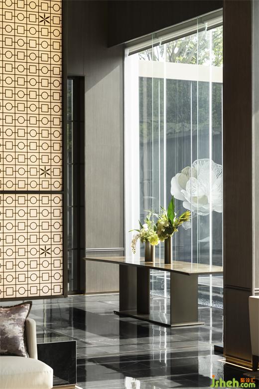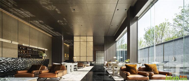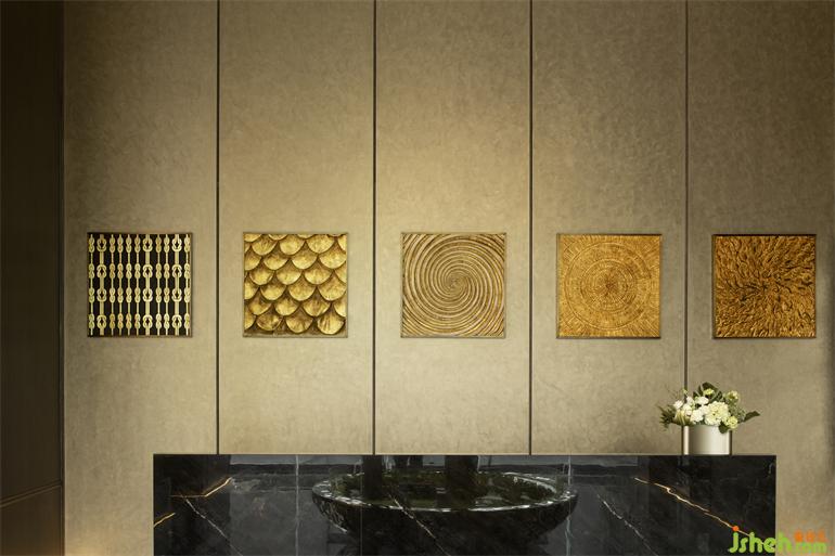 由寧波市市花山茶花演變而來的云石燈箱花紋,簡約的序列視覺感讓空間立體純粹,光線的擴散使氛圍增感強,平靜優(yōu)雅之余,亦多了一種光影和結構的表現(xiàn)。售樓處設計在黑與金的加持下,純粹精致感映入場景內(nèi)核。