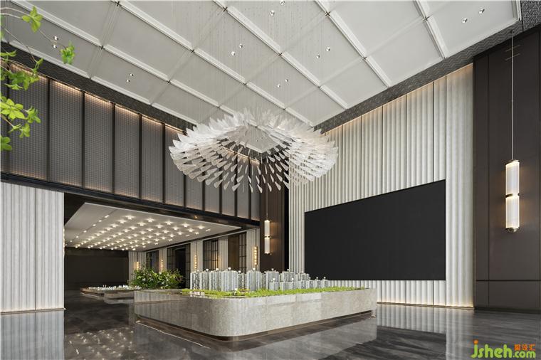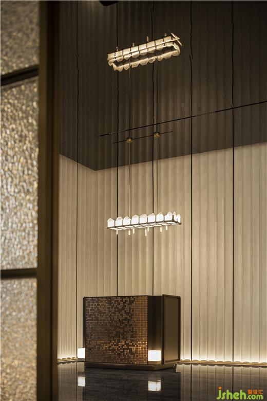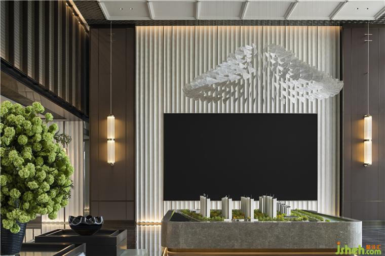 項(xiàng)目LOGO作深化演變,詮釋路勁地產(chǎn)的品牌文化,裝置由透明的藝術(shù)玻璃元素組成線性的紋理,展示中心設(shè)計(jì)通過(guò)不同的角度移動(dòng)時(shí),創(chuàng)造迷人的光模式。利落的線條帶來(lái)簡(jiǎn)約的視覺(jué)感讓空間立體純粹,感受到舒適奢華的酒店式空間。