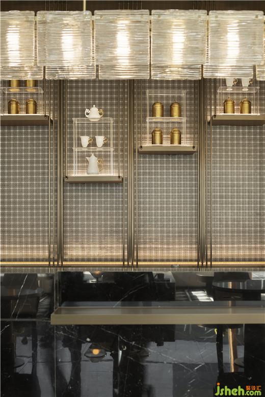 水吧臺(tái)兼具酒店式服務(wù),臺(tái)面石材紋理飽滿,燈光與地面陰影的轉(zhuǎn)變、頂面裝置互動(dòng),三者明暗不一、動(dòng)靜各異的變化,展示中心設(shè)計(jì)繪制出具象化的空間情緒。