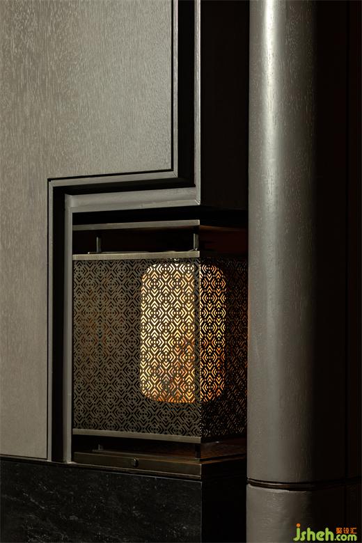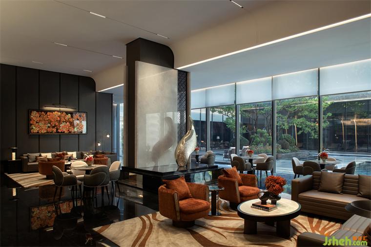 通高的空間尺度借鑒園林中的開闊與高遠(yuǎn),使空間顯得更加寬敞明亮,給人以無(wú)限遐想。水晶燈如月光傾灑而下,為大廳披上了一層神秘的銀紗,黑白的拼花地面又在光影的交錯(cuò)中凸顯空間層次和深度,與東方美學(xué)意境相得益彰。端景如園林中的亭臺(tái)以一種跨越時(shí)空的姿態(tài)成為空間焦點(diǎn),紅花的點(diǎn)綴增添了一絲不羈的靈動(dòng)。