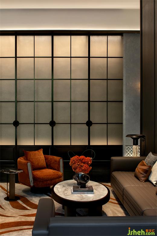 深色調(diào)的墻壁和天花圍合穩(wěn)定的框架,出靜謐而專注的沉浸式氛圍,簡(jiǎn)約的垂直線條強(qiáng)化區(qū)域的縱深感和高度感,水平向線條平衡空間結(jié)構(gòu),共同透出穩(wěn)固有序的氛圍。