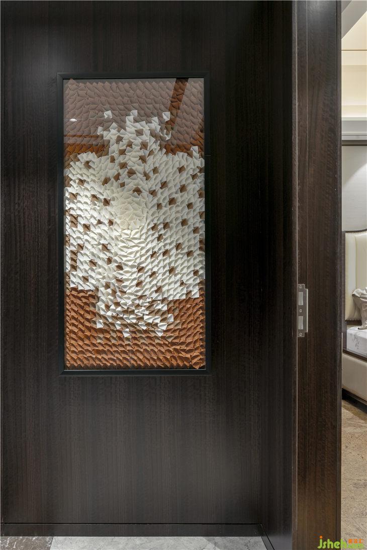 設(shè)計是表達者最忠實的記錄和呈現(xiàn),空間即會盛放真實且有力量的內(nèi)心與生活??蛷d天花輕盈流暢的線條,錯落有致,打造獨特層次感,搭配高質(zhì)感的灰色調(diào)真絲墻布背景,延伸了視覺,和諧而不繁復(fù)。胡桃木的溫暖色調(diào)圍繞著整個空間,極具藝術(shù)奢華的金屬主燈,與金屬不銹鋼包裹的冷峻感石材茶幾相互呼應(yīng),搭配幾何形地毯,上演了一場張弛有度的節(jié)奏韻律。不同質(zhì)感的材料與材質(zhì)在空間里相互融合,亦如你我在不同的人生軌跡里碰到的不同的人,歷經(jīng)的不同的事,最后歲月予以平靜和諧的安放在記憶深處里,不偏不倚。