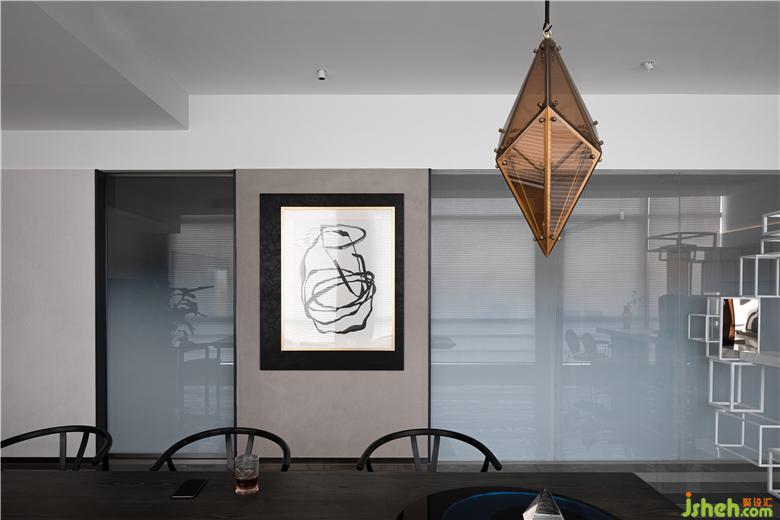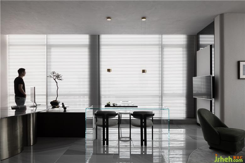 總經(jīng)理辦公室營(yíng)造的是一個(gè)簡(jiǎn)約輕奢又帶有淡淡中式文化底蘊(yùn)的空間,掛畫(huà)、大班臺(tái)石材臺(tái)面、花瓶、地磚等表面波浪紋理形成了一種水墨流淌的氣息,橢圓的大班臺(tái)和圓形的茶幾讓空間更為柔和親切,超白玻璃茶臺(tái)搭配簡(jiǎn)約的原石茶具,還有造型精致的德國(guó)原裝進(jìn)口OCCHIO小吊燈,讓整個(gè)空間顯得干凈而且統(tǒng)一,隨著百葉狀香格里窗簾除除升起,窗外開(kāi)闊的景觀躍然眼前,置身其中,有一種忘卻浮世繁華的寧?kù)o。
