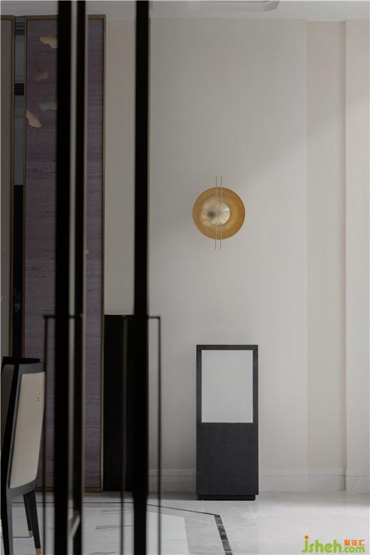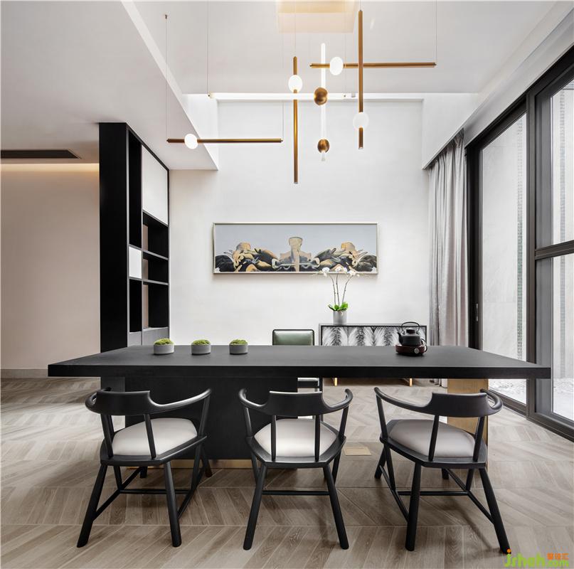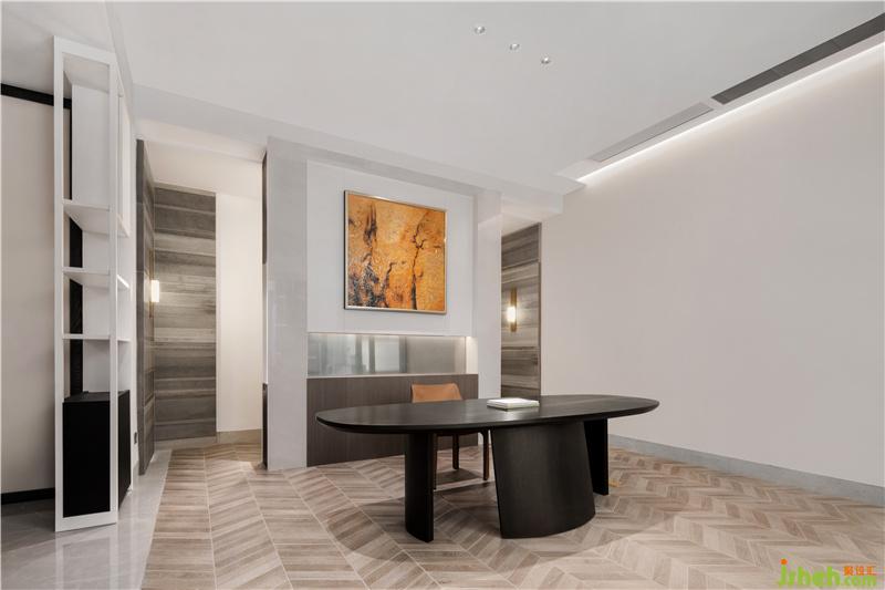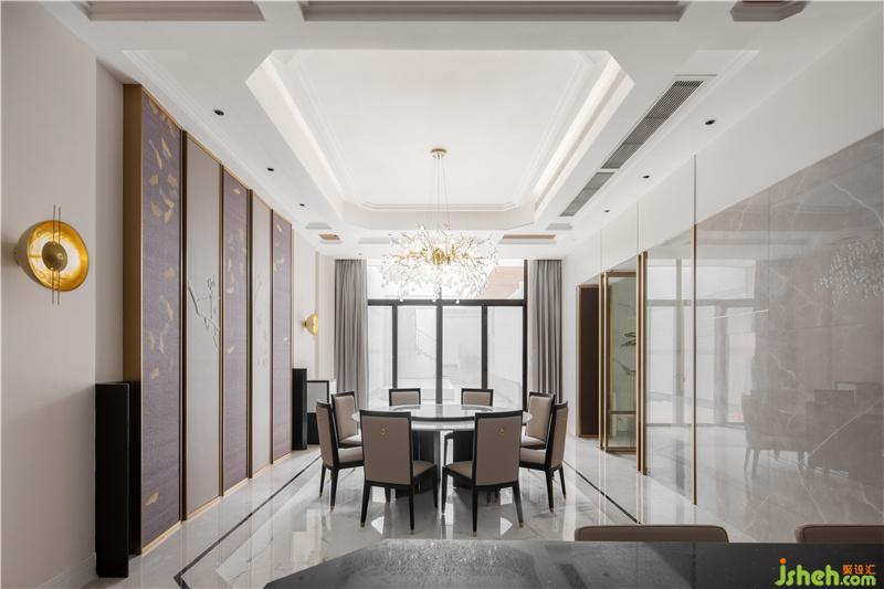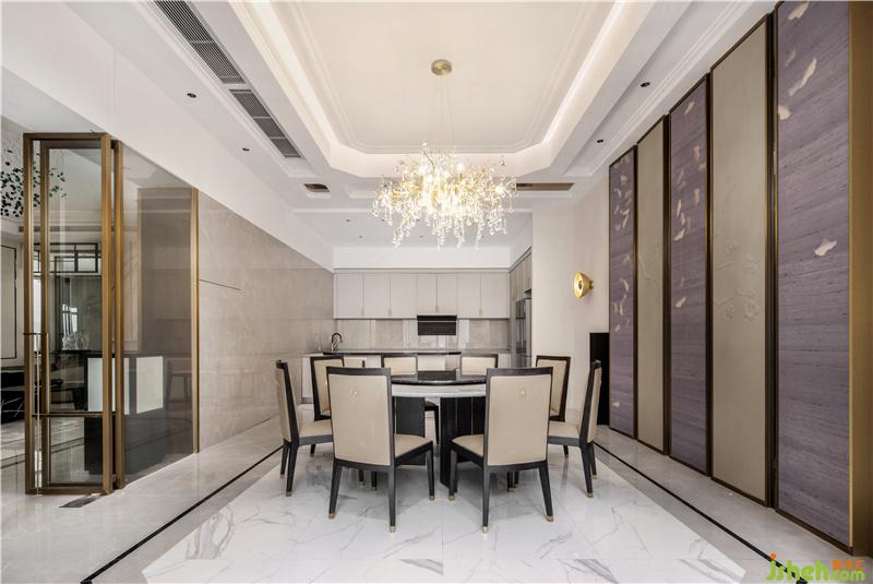 與會客廳相連的餐廳位置,則繼續(xù)沿用了會客廳中的主要設(shè)計風(fēng)格,由現(xiàn)代設(shè)計手法簡化而來屏風(fēng)造型,再配以與造型天花相互呼應(yīng)的地面線條,大氣但不失情調(diào)的餐廳空間躍然眼前。