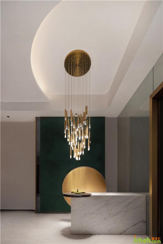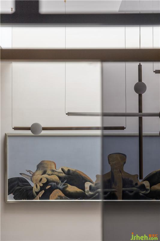 與會客廳相連的過道是整個地下一層的緩沖區(qū)域,貫穿右側(cè)的吧臺,讓空間得到了延伸,同時兼具導(dǎo)向意義。由于負(fù)一層層高達(dá)到了4.6米,所以樓梯步級特別長,因此設(shè)計師在中間平臺處做了一個設(shè)計轉(zhuǎn)換,既打破了長樓梯帶來的心理壓力,同時增添了設(shè)計的趣味性。