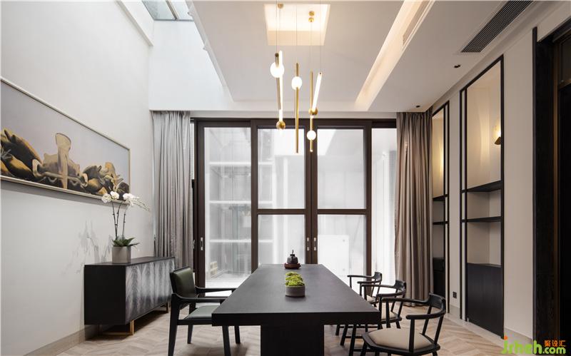 兼具了茶室與娛樂功能的書房空間,可理解為男主人緊張工作與放松娛樂接待好友的專屬天地,設(shè)計師在此空間中營造了相對較濃的中式氛圍,并在茶室上方設(shè)計有透光井,直透一層花園,讓空間得到了延伸,并打破了地下一層的封閉感,在工作與娛樂之余安靜地品茶細(xì)思,抬頭便是那片夜空或藍(lán)天。書房門口則是一個直通地面的中空小花園,陽光可直達(dá)花園及室內(nèi),讓原本顯得雞肋的地下空間充滿生氣。