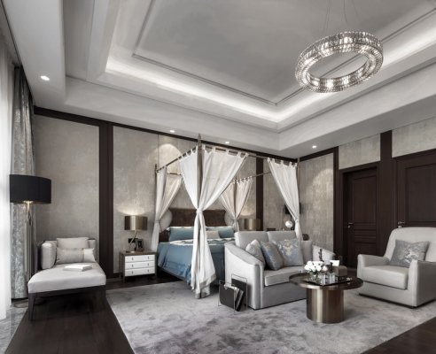 另外,空間大部分高端進口家私都選自業(yè)主經(jīng)營的品牌,選用白藍兩色作為整個空間的基色調(diào),象征著海天一色,減少了原本濃厚的歐式氛圍,從而保持空間內(nèi)部純凈清爽的海洋氣息。