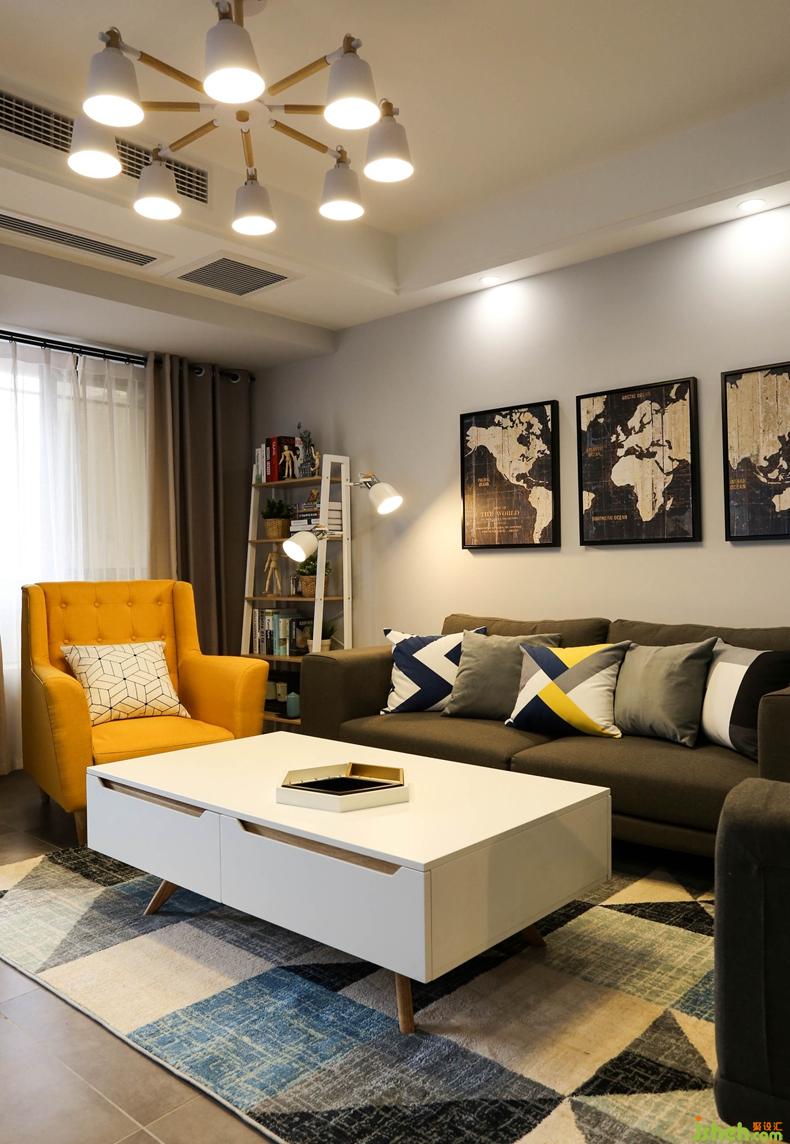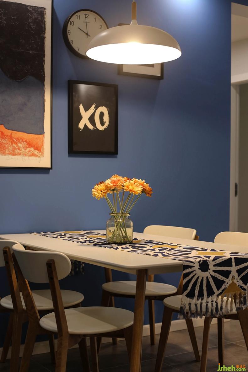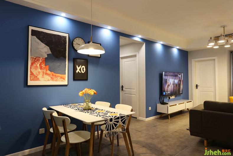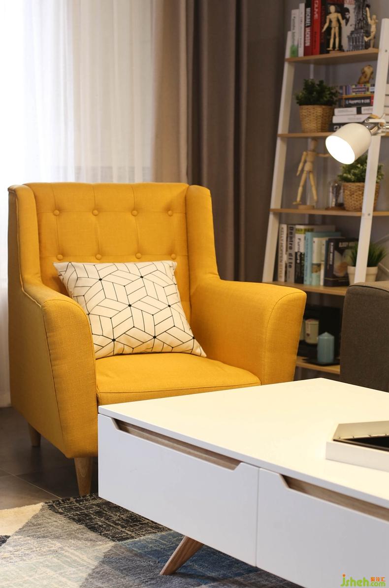 顏色運用上整個空間是以色塊形式表達,以及用深藍色乳膠漆搭配移動家具單人黃色沙發(fā),會在其他軟裝上會有相互呼應的顏色搭配。