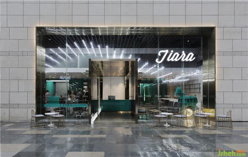 源自于服裝T臺、香檳金不銹鋼包裹的狹窄入口走廊,地面的光帶散發(fā)到金屬板表面的反射,裝修設(shè)計營造出未來時尚科技感的光影,配合著走廊無限播放的時尚秀場畫面和音樂,心情隨之澎湃起來;沿著T臺走到那抹指引動線的蒂芙尼藍(lán)極簡收銀臺,轉(zhuǎn)角進(jìn)入淳樸的休息區(qū)空間,大有桃花源般豁然開朗的感覺。連接各區(qū)域之間的吊頂用鋼板拉伸網(wǎng)材料,把天棚管道線路給掩蓋掉,既延續(xù)了粗獷的質(zhì)感,又流露出對細(xì)節(jié)的細(xì)膩處理。