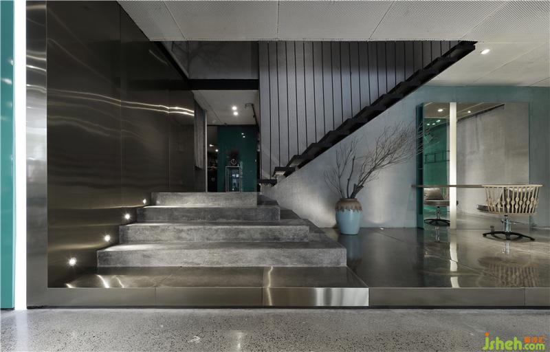 香檳金屬富有強(qiáng)烈的時尚感、水泥代表著工業(yè)粗拙的原始質(zhì)感、蒂芙尼藍(lán)用于調(diào)和空間冰冷的色調(diào),經(jīng)過提煉出來的這三種截然不同的材質(zhì)元素演繹著這個時尚美發(fā)空間。裝修設(shè)計