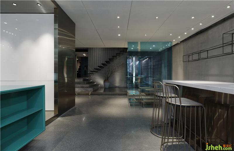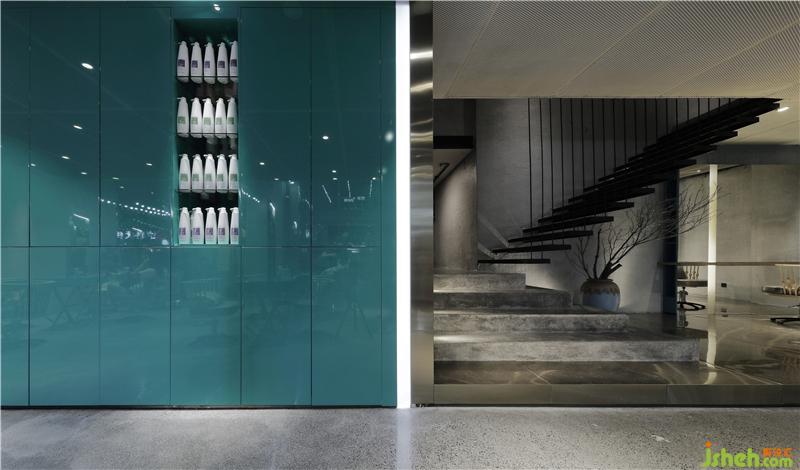 歌劇舞臺(tái)概念的貴賓區(qū),用一個(gè)強(qiáng)烈的L型金屬體塊劃分出來(lái),粗獷的水泥臺(tái)階、黑色的鋼吊工業(yè)樓梯、淳樸的樹(shù)枝陶瓶裝飾、通透的蒂芙尼藍(lán)玻璃隔斷,組合在一起,頗有舞臺(tái)場(chǎng)景的畫(huà)面感。與之相鄰的蒂芙尼藍(lán)盒子中間用一條光帶切割出空間的界限,獨(dú)立又極富雕塑感。而在美發(fā)區(qū)又回歸到原始淳樸的空間感覺(jué),目的是為了讓專業(yè)回歸本源,安靜的專心做一個(gè)屬于自己的發(fā)型。裝修設(shè)計(jì)