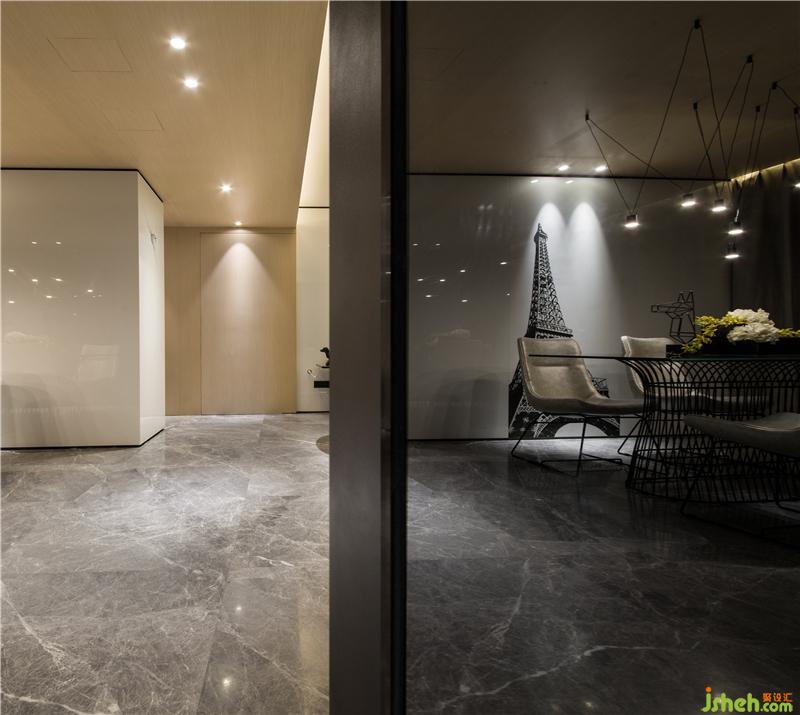 踏入玄關,土耳其灰大理石的地面延伸至公共區(qū)域,走廊兩側在滿足儲物功能需求的前提下,表面全部用黑色填滿,目的是讓人的心情迅速的平靜下來;而天棚上那一抹溫潤的木色把視線指引到更光明的地方,慰藉著疲憊的身心。樣板房設計