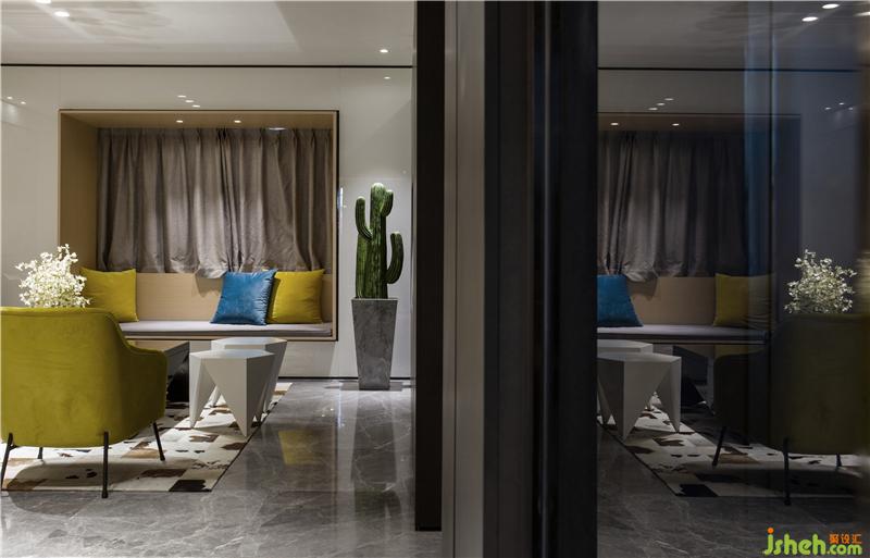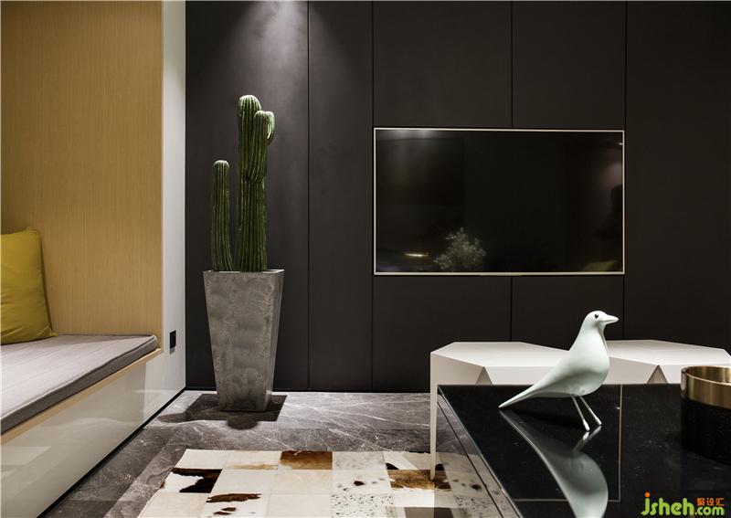 整體空間的動靜區(qū)域規(guī)劃分別以黑白色系來區(qū)分。黑色是謐靜,白色是純凈,過分的純粹反而讓空間感覺到冰冷,甚至會令人產生距離感;而家是有溫度的空間,所以在追求時尚感的同時,選用代表著希望和朝氣的黃色系,對空間環(huán)境進行調劑。樣板房設計