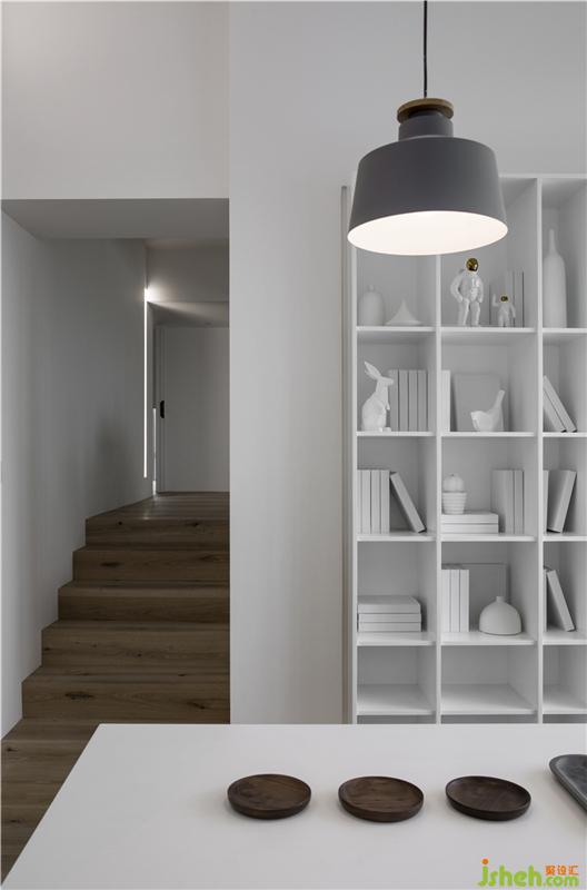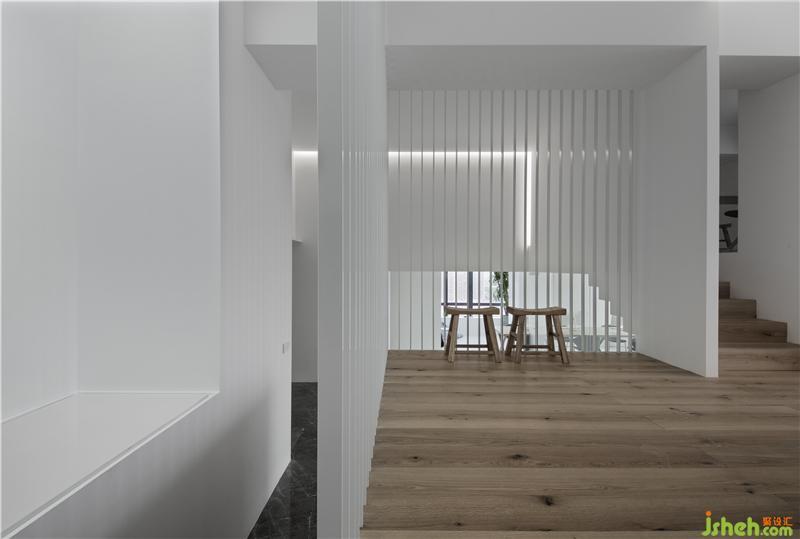 經(jīng)過(guò)反復(fù)驗(yàn)證,把洽談和會(huì)議功能這個(gè)區(qū)域的地面高度降低,形成一個(gè)中轉(zhuǎn)平臺(tái),并把所有的收納功能集合在這個(gè)盒子內(nèi),用原木包裹,形成空間的樞紐中心;為了保證隱私、通風(fēng)采光及安全,盒子的圍擋采用矩管格柵的形式,通過(guò)格柵觀看樓梯邊的佛像及樓梯下行走的人,會(huì)讓平靜的空間產(chǎn)生互動(dòng)的波瀾。在二樓挑空的墻體上的那條縫,也是起到采光通風(fēng)的作用,并避免視覺(jué)上的擁堵。辦公室設(shè)計(jì)