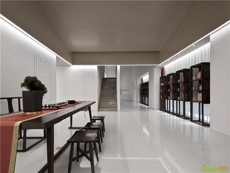 而入口對面的形象墻,我們也摒棄了傳統(tǒng)品牌形象墻的表現(xiàn)方式,以表達品牌文化為主要的呈現(xiàn)手法,前面擺放中式茶桌,加強品牌的親和力。裝修設計