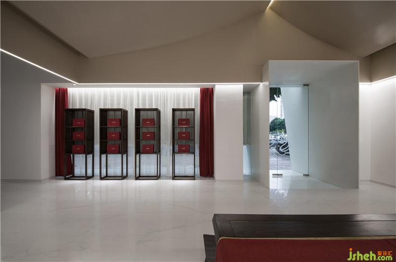 通過一個白色的長方形盒子,我們進入了內(nèi)部空間,整個大堂空間讓人覺得空靈又溫暖,天棚由兩片弧形組成,有著似曾相識的感覺;這是由民居屋頂演化過來的,用現(xiàn)代的表達方式來呈現(xiàn)文化記憶,而天棚顏色則是兒時記憶的屋頂瓦片顏色所提取的。裝修設計
