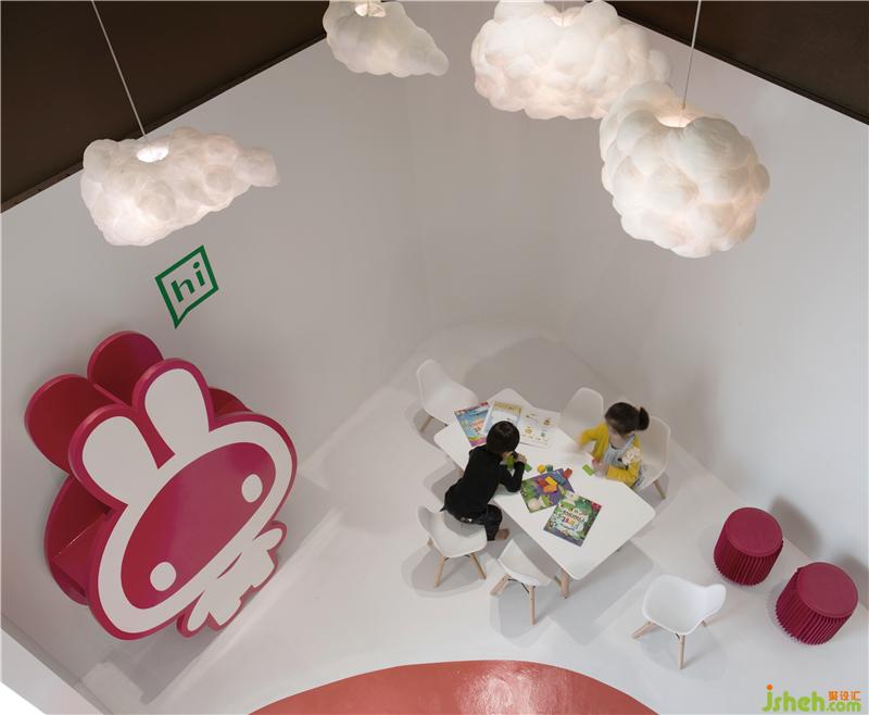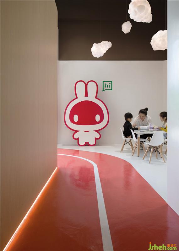 在空間色彩的選擇上,我們以白色為主要基調(diào),在空間的焦點區(qū)域,使用會使人穩(wěn)定情緒和感覺到安全的木頭原色,教室內(nèi)部區(qū)域也選用與木頭顏色相近的PVC編織地毯,同時也保證了孩子在活動時的安全性;紅色作為西柚兔少兒英語教育品牌的VI主色調(diào),我們在跑道和部分指示進(jìn)行了延伸,而作為輔助色的綠色對話框,則被延伸成每個空間區(qū)域的指示牌和趣味學(xué)習(xí)元素。