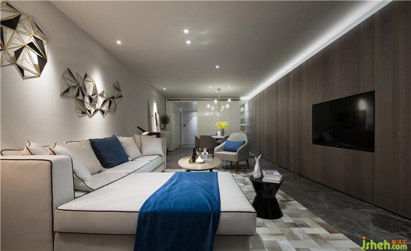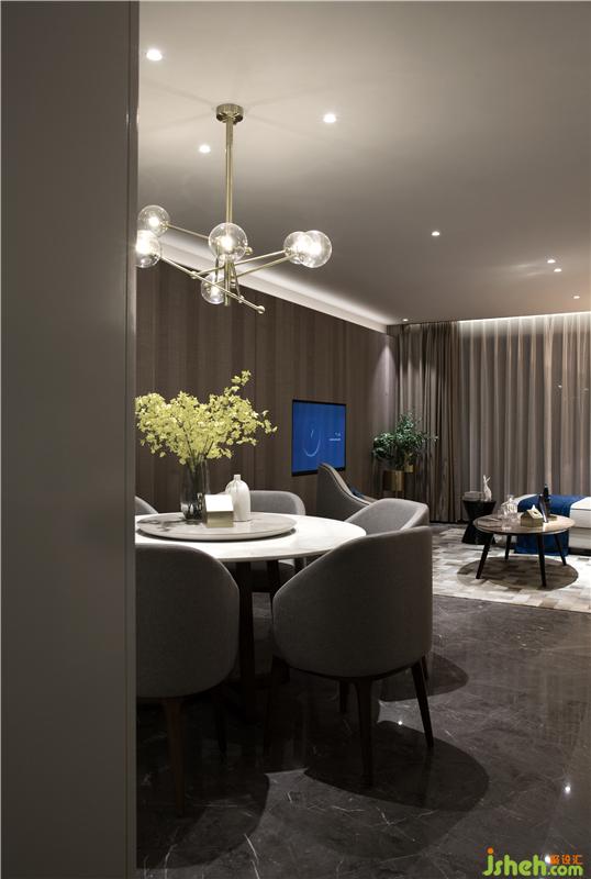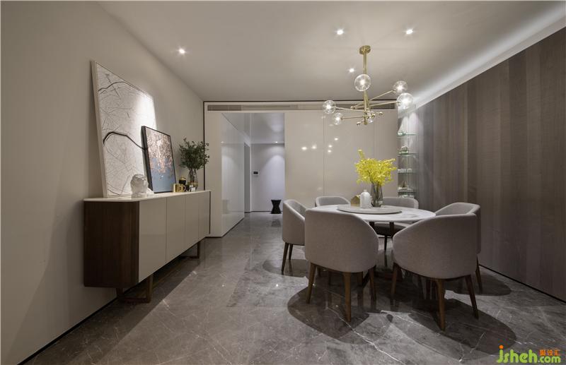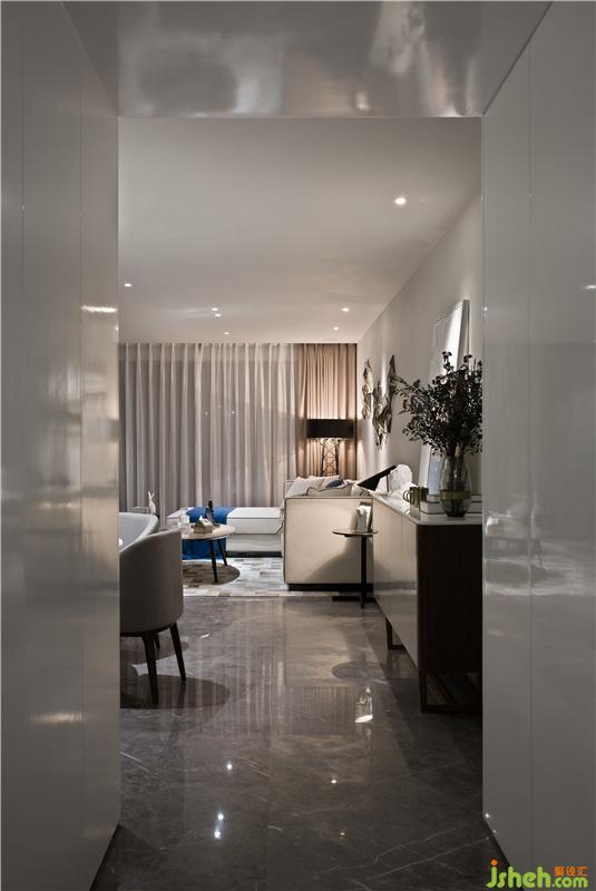 以電視墻隔開活動區(qū)和休息區(qū),為了增大活動區(qū)的視覺空間,活動區(qū)的門全部以隱藏的形式。從客廳往廚房方向看,玄關(guān)和廚房融為一體,形成一個(gè)白色的盒子,成了這個(gè)空間的視覺焦點(diǎn),而活動區(qū)的所有空調(diào)設(shè)備全部隱藏在白色盒子內(nèi),最大限度的抬高客廳及餐廳的層高,避免壓抑。電視背景墻與休息區(qū)入門及餐廳背景墻做成一體,讓活動區(qū)更加整體。室內(nèi)設(shè)計(jì)師