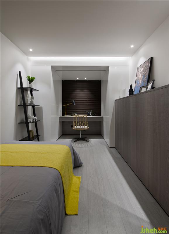 左手第一間是兒童房,利用承重墻的墻垛,分開做了兩個衣櫥,中間的窗戶區(qū)域則做成了書桌,整體形成一個白色的盒子,呼應(yīng)活動區(qū)的廚房白盒子;另一張床則隱藏在書柜里,這是滿足主人未來的成員需求。室內(nèi)設(shè)計師